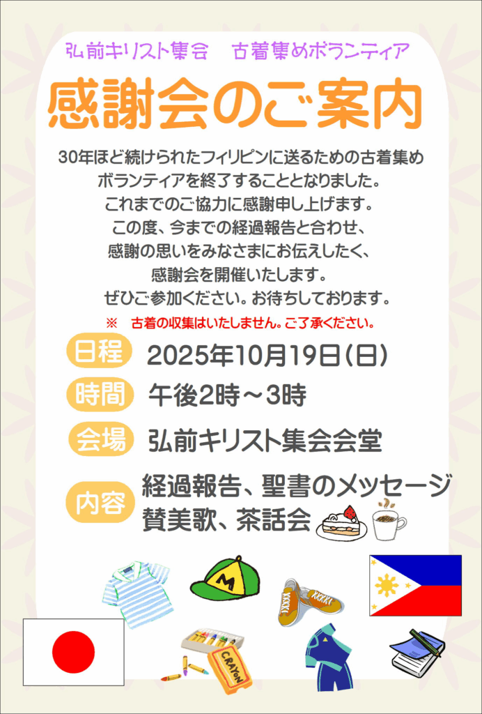 2025年9月29日 / 最終更新日 : 2025年10月1日 hrs-isaiah 古着集めボランティア 弘前キリスト集会 古着集めボランティア感謝会 開催日: 2025年10月19日カテゴリー: 古着集めボランティア, 特別企画 ※ 古着の収集はいたしません。ご了承ください。